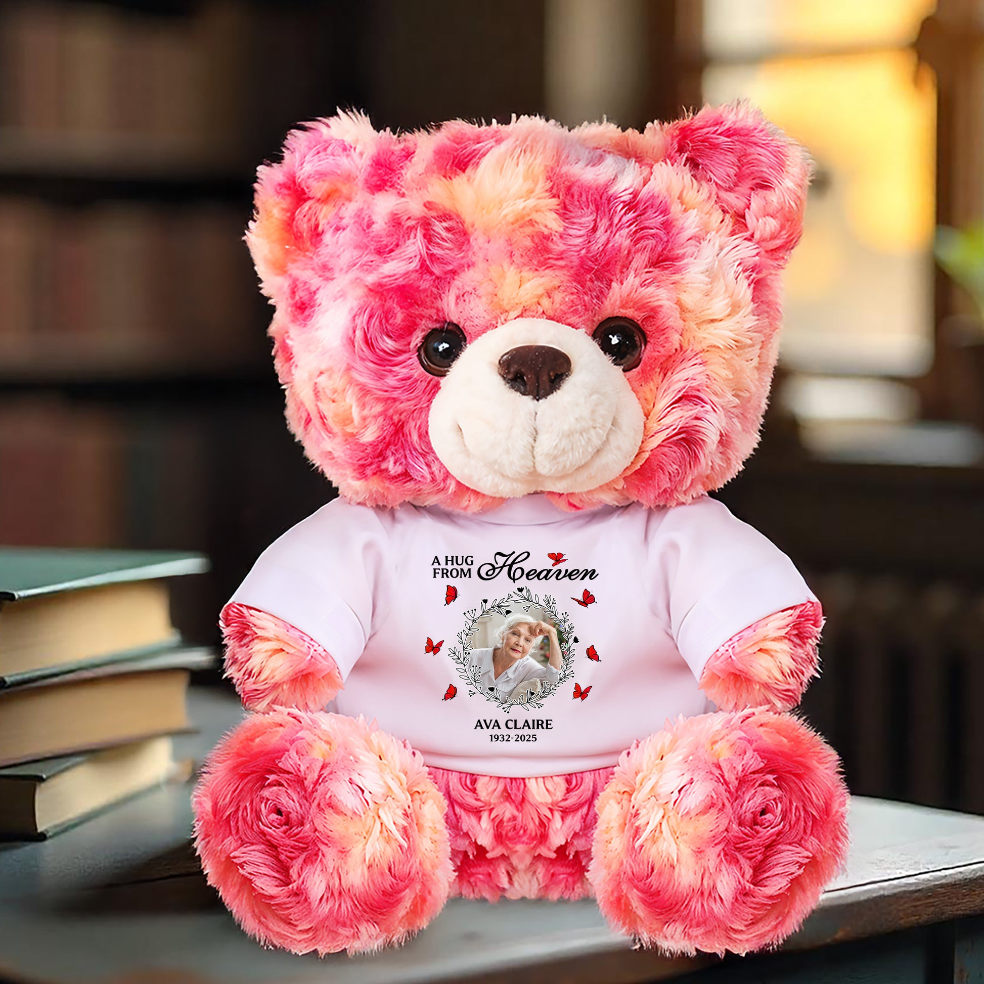 Keep the memory of a loved one close with this soft, customizable teddy bear. Add a photo, name, and dates to create a comforting keepsake that brings a little "cuddle from heaven" to anyone who needs it.