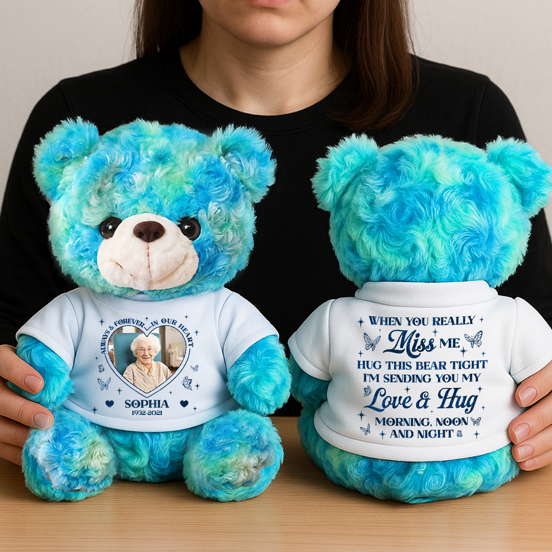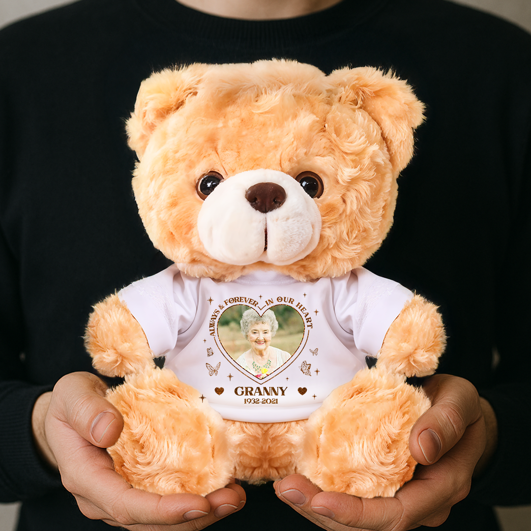 Keep the memory of a loved one close with this soft, customizable teddy bear. Add a photo, name, and dates to create a comforting keepsake that brings a little "cuddle from heaven" to anyone who needs it.