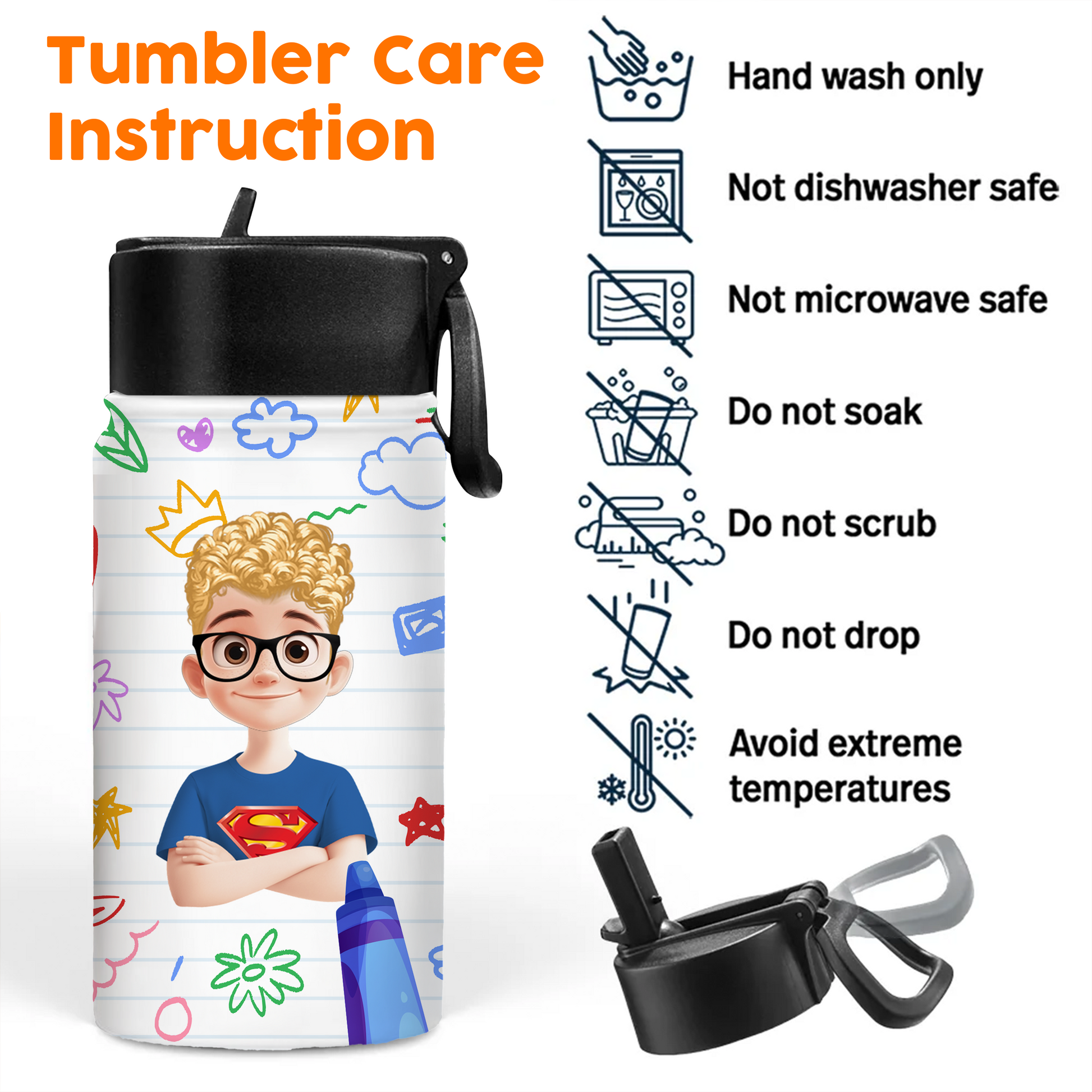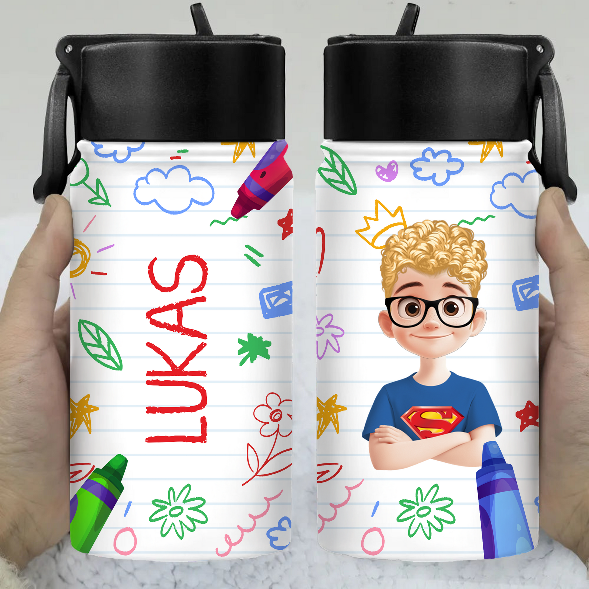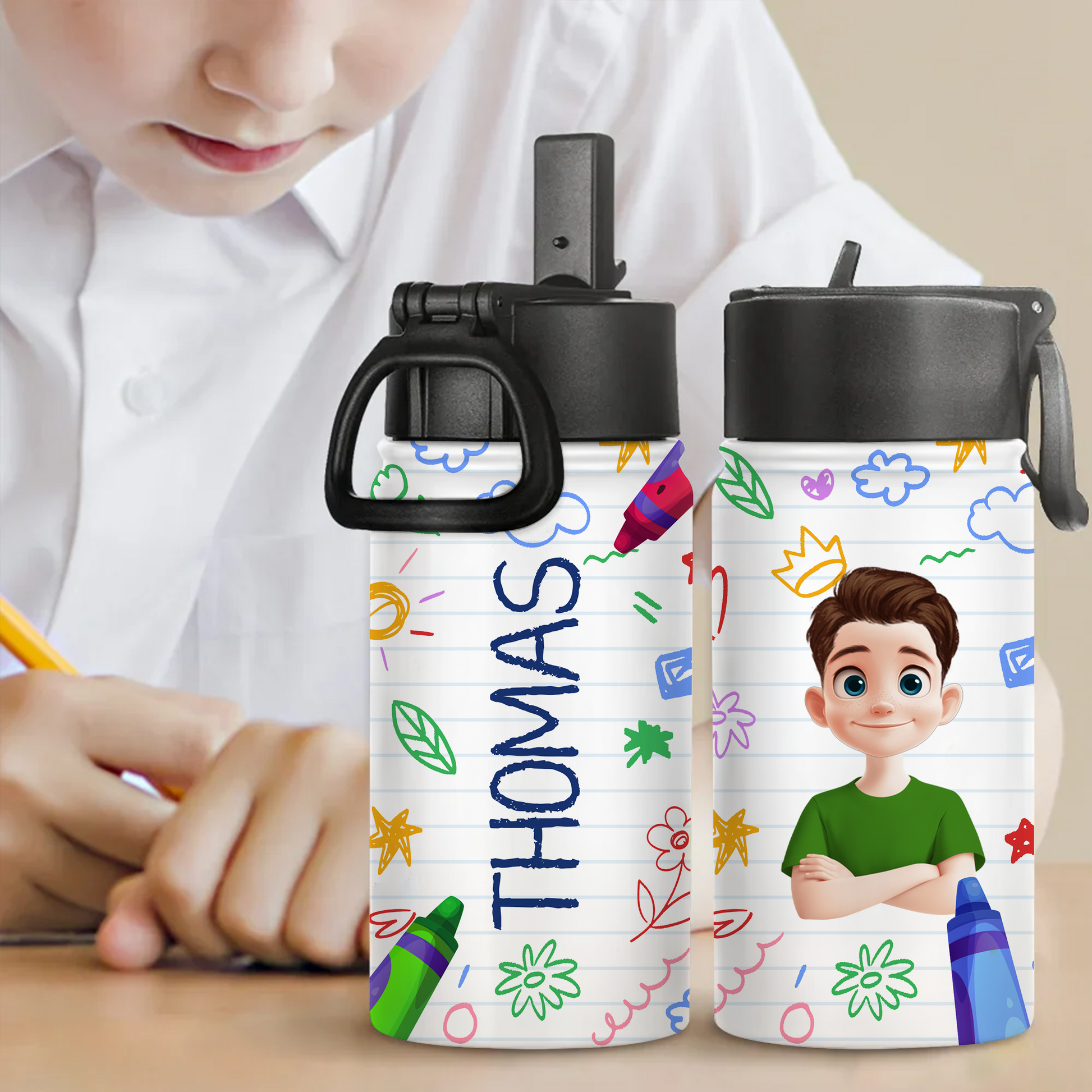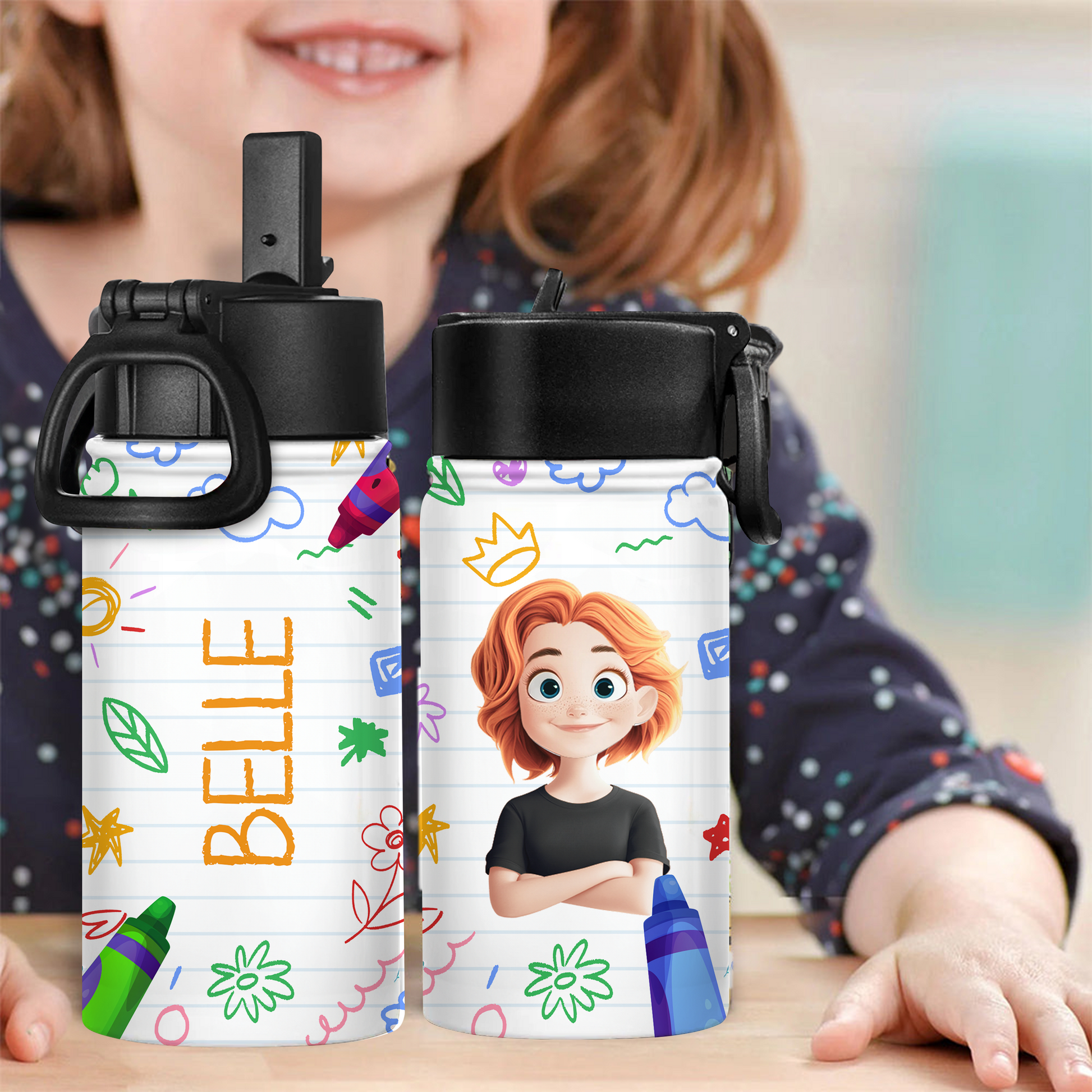Bottle Kids Cups With Name Drawing - Back to School Water Bottle With Straw Lid - 12 oz Stainless Steel