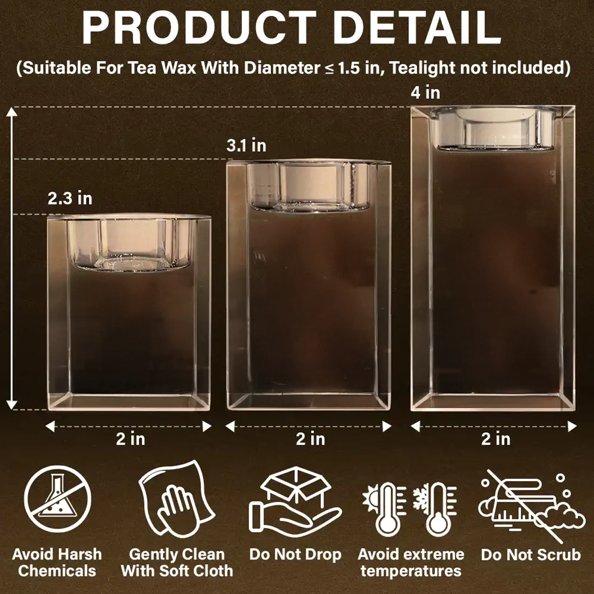 - Large: 2 x 2 x 4 inches ( ~5 x 5 x 10 cm). Weight: 530g - Suitable for tealight with a diameter ≤ 1.5 inches. Tealight is not included.