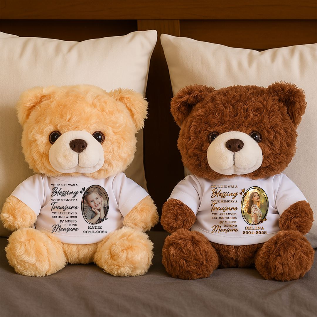 Keep the memory of a loved one close with this soft, customizable teddy bear. Add a photo, name, and dates to create a comforting keepsake that brings a little "cuddle from heaven" to anyone who needs it.