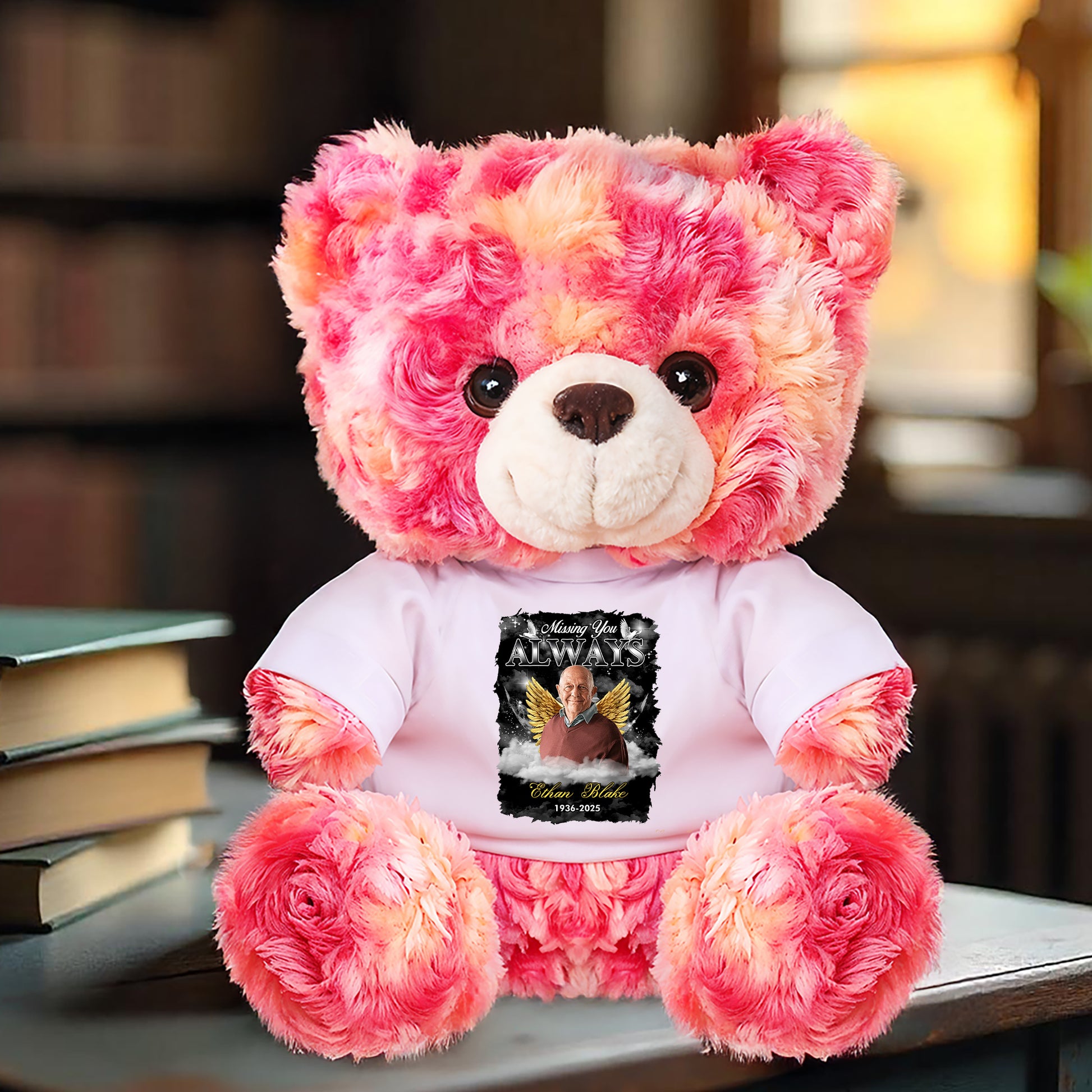 This teddy bear is a cozy blend of comfort and sentiment, perfect for snuggles and lasting memories. With its plush softness and personalized T-shirt, this bear is more than just a toy, it is a cherished keepsake full of sentiment
